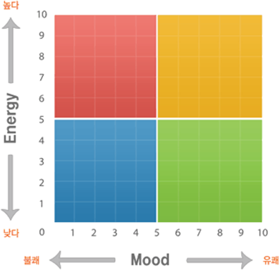 0에 가까울수록 힘이 없는 것을 의미하며, 10에 가까울수록 힘이 넘치는 것을 의미합니다. - 가로축은 현재 내가 느끼는 기분(Mood)입니다.